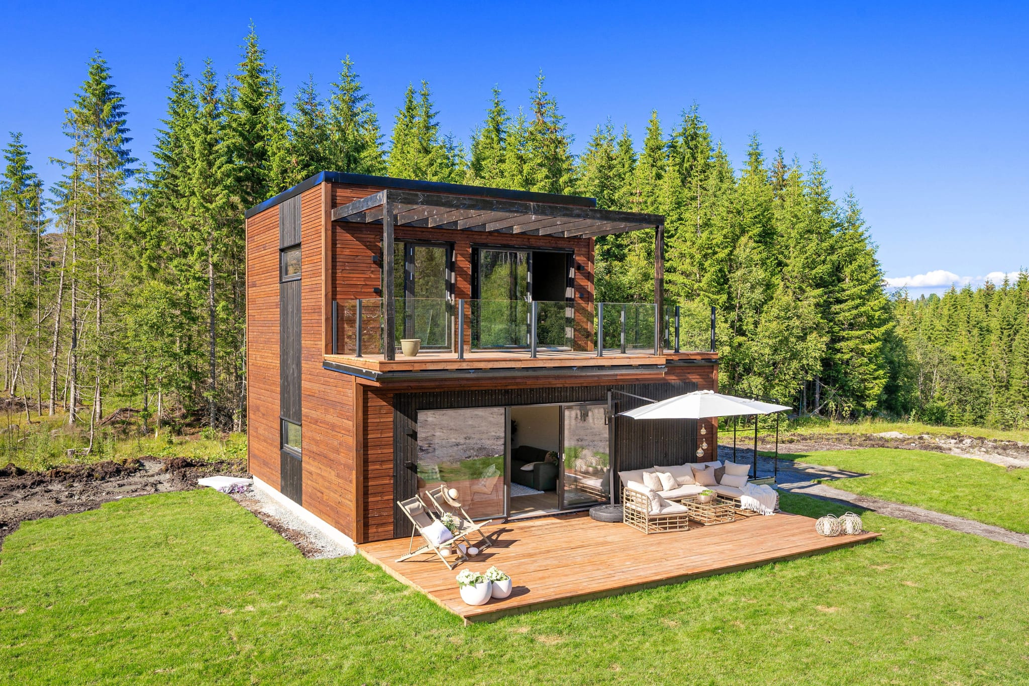 Velkommen til Kolonihagen i Herjuanvegen, Malvik. Dette er en fantastisk mulighet til å eie en topp moderne hytte i funkisstil med stor takterrasse på 18 kvm, privat kolonihage, mulighet for drivhus, bilvei helt frem og privat parkeringsplass.